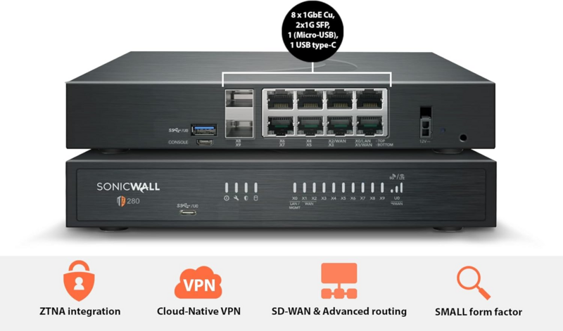 SonicWall TZ280 Next-Generation Firewall (03-SSC-1824) – 940 Mbps Throughput, 750 Mbps Threat Prevention, Secure SD-WAN